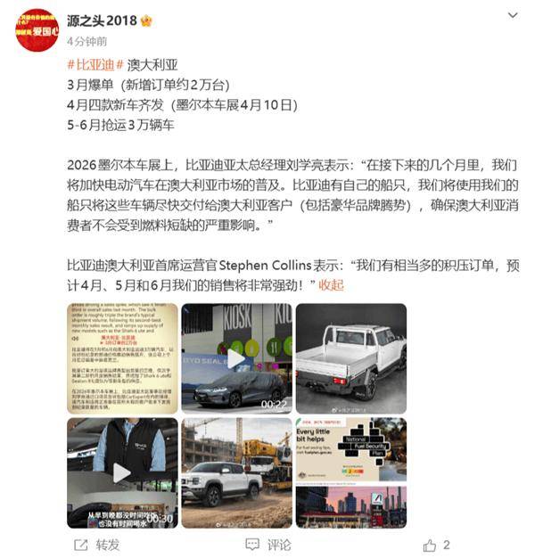 4月13日消息,据博主“源之头”透露,比亚迪3月份在澳大利亚实现爆单,新增订单约2万台。
