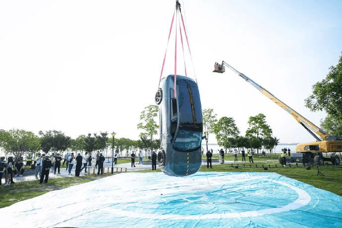在这次试验中,星纪元ET被起重机悬挂至高空,车头向下车身垂直于地面,最低端距离地面达到31.9米,这相当于是从11层楼的高度往下扔。