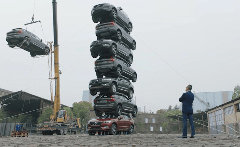 在试验中,沃尔沃亚太地区总裁兼CEO袁小林亲自坐进了一辆沃尔沃XC60中,并随着吊车将一辆辆同款车型叠放在他的车辆上方。