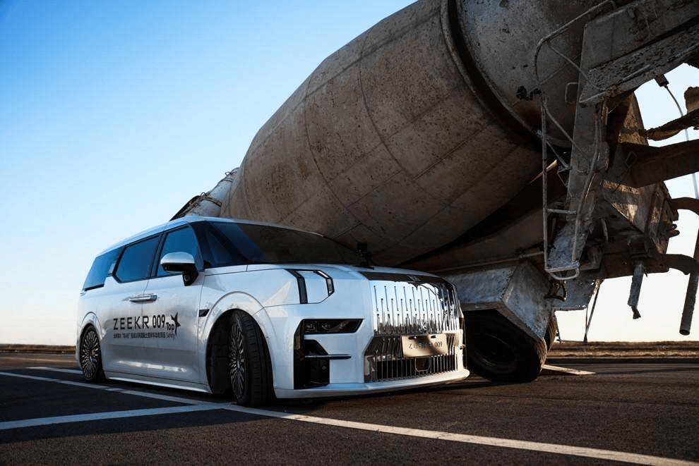 但极氪009有意要去挑战下水泥搅拌车,30吨混凝土搅拌车的侧翻压顶,极氪009支撑住了。