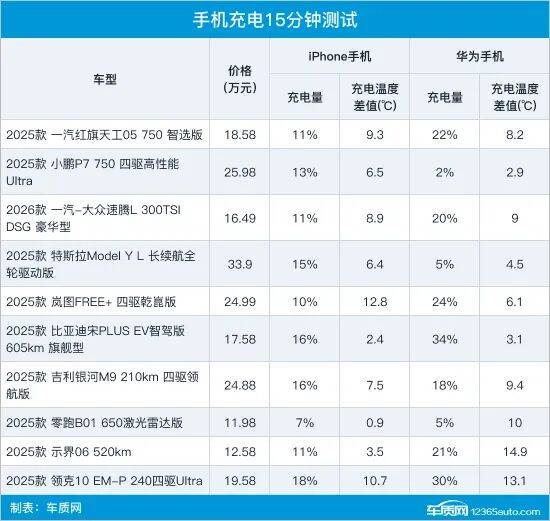 综合来看,在iPhone手机充电15分钟测试中,比亚迪宋PLUS EV的整体表现最佳,在保证高效充电的同时,温差仅为2.4℃。同样表现不错的还有特斯拉Model Y L和吉利银河M9,不仅充电效率表现不错,温差也保持在可以接受的水平。