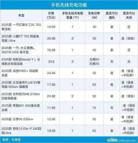 通过10款车型手机无线充电功能对比可以发现,小鹏P7、特斯拉Model Y L和吉利银河M9均配备了2个无线充电板,但特斯拉Model Y L未提供通风散热功能,与另外两款车型相比还有提升空间。此外,一汽红旗天工05、一汽-大众速腾L和特斯拉Model Y L的手机无线充电功能都不支持关闭,而岚图FREE+、比亚迪宋PLUS EV、零跑B01、示界06和领克10 EM-P均支持两种关闭方式,实用性表现更出色。