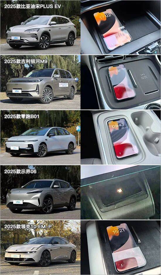 此次参与测试对比的10款车型中,比亚迪宋PLUS EV的综合表现处于领先地位,对于iPhone和华为手机的充电效率较高,手机发热量也控制合理,并且手机无线充电还支持中控屏+语音的关闭方式,但仅配备了1个手机无线充电板成为了唯一的遗憾。表现同样值得肯定的还有领克10 EM-P,只是对于手机充电发热量控制还有待优化。相对而言,零跑B01综合表现一般,由于配备的无线充电板功率偏低,因此对于两款手机的充电效率都不高,存在较大提升空间。