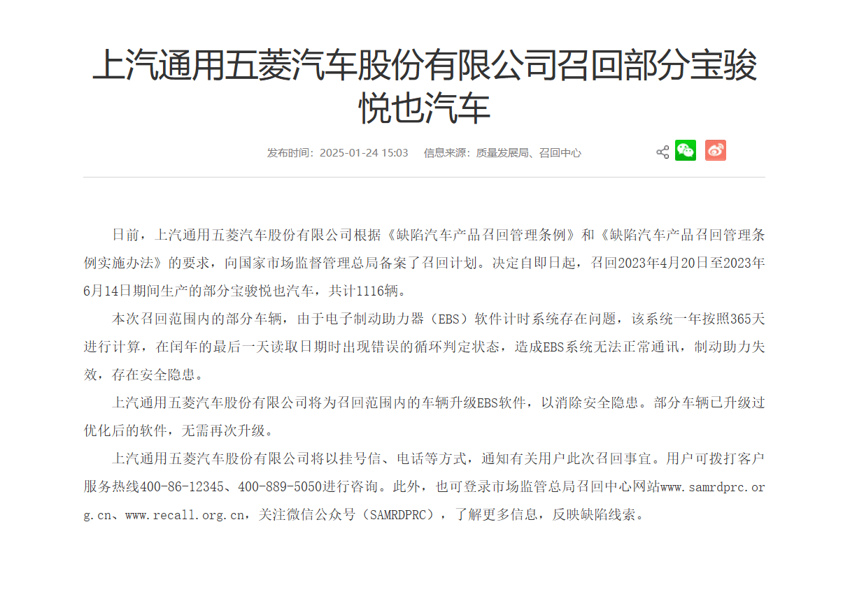 针对这一问题,宝骏汽车最终启动了召回程序。根据国家市场监督管理总局2025年1月24日发布的公告,上汽通用五菱决定召回2023年4月20日至2023年6月14日期间生产的部分宝骏悦也汽车,共计1116辆。