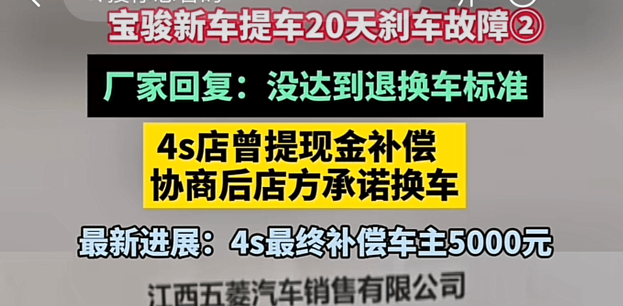 宝骏新车20天遇刹车故障?4S店曾答应换车,厂家称未达退换标准