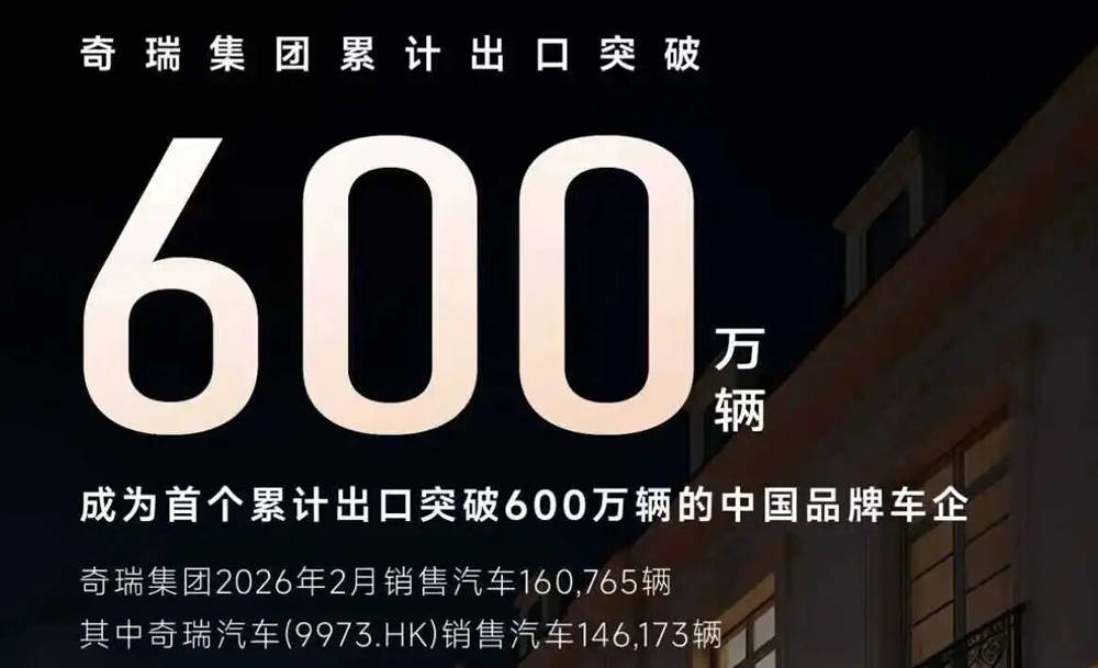 根据奇瑞集团公开的产销快报显示,集团2月销量160765台,今年前两个月累计销量超过38万台,其中,奇瑞汽车2月销量146173台。目前,奇瑞集团累计出口已突破600万台,成为首个累计出口超过600万台的中国品牌车企。