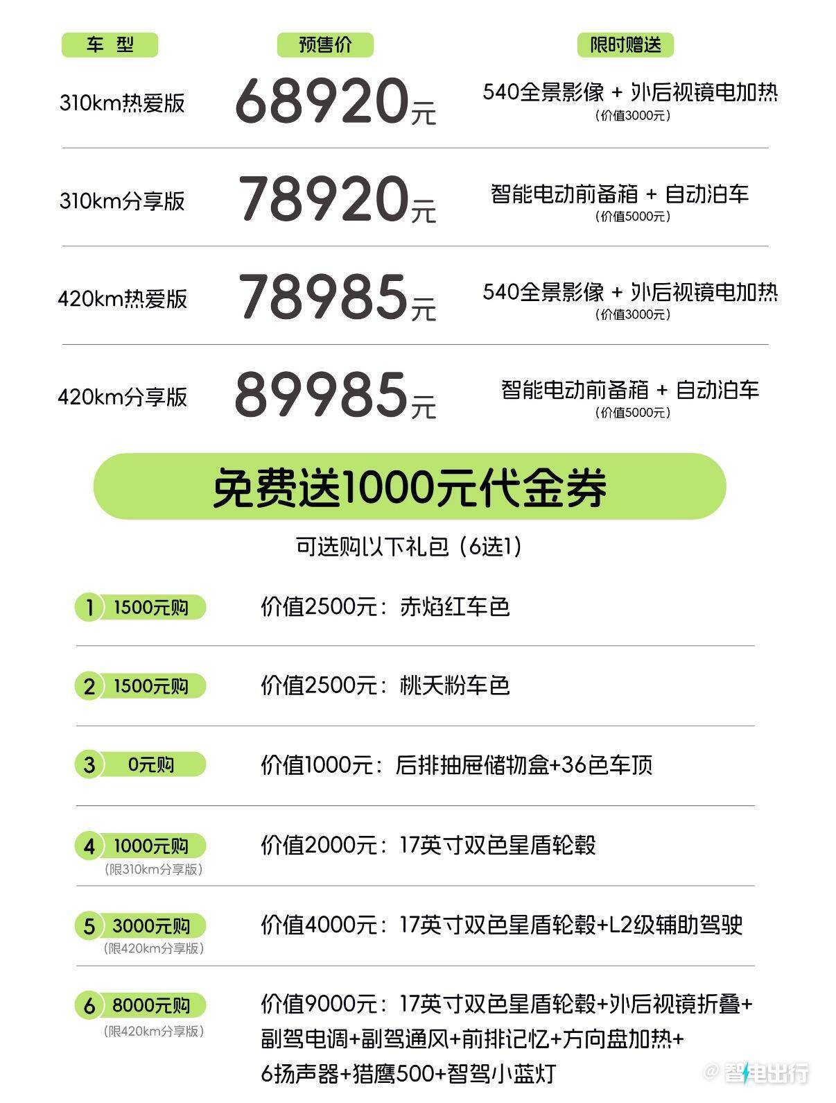 3月10日,奇瑞官方宣布:全新QQ3正式开启预售,共推出4款车型,价格区间为6.892万元-8.9985万元。预订310km分享版和420km分享版的客户,厂家限时赠送价值5000元的“智能电动前备箱+自动泊车”。